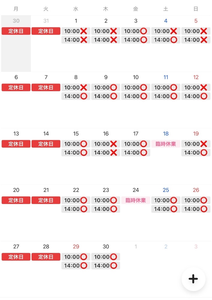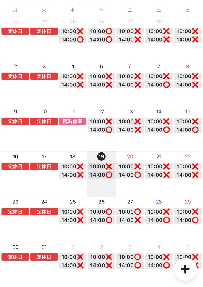 カレンダーは空き状況をお知らせするものであり、カレンダーよりご予約などの移行は出来兼ねますので、ライン、メール、お電話にてお願い致します。※ 営業時間外をご希望の場合はご相談下さい。更新は多少の遅れが生じる場合もございますので、何卒ご理解下さいますようお願い申し上げます。